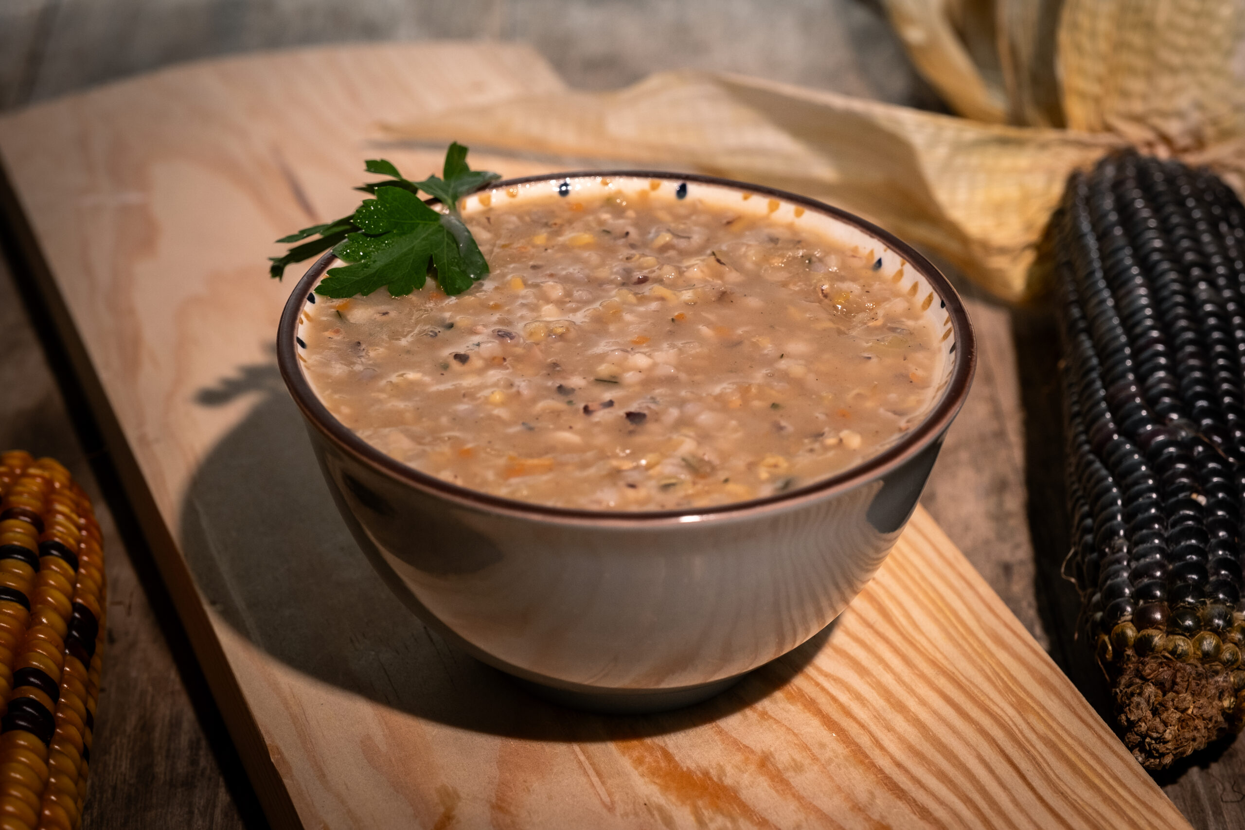 Bulgur de maíz morado ecológico tostado Maiziam, vegetales deshidratados (cebolla, calabacín, zanahoria y puerros), almidón, aromas, proteínas de ave, jugo concentrado de zanahoria, fibra vegetal, especias y harina de maíz ecológico tostado Maiziam.